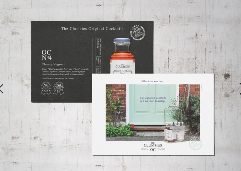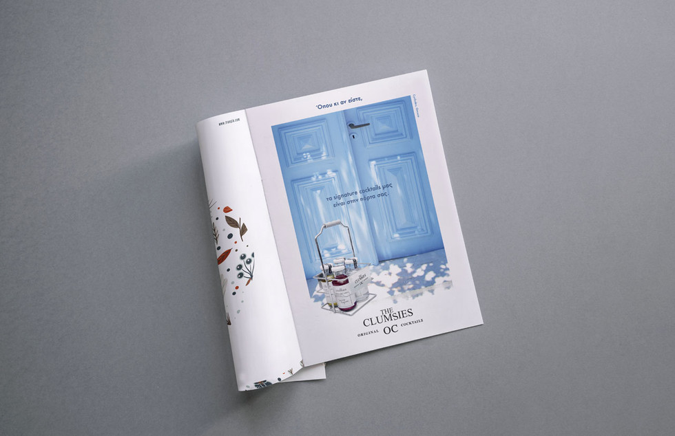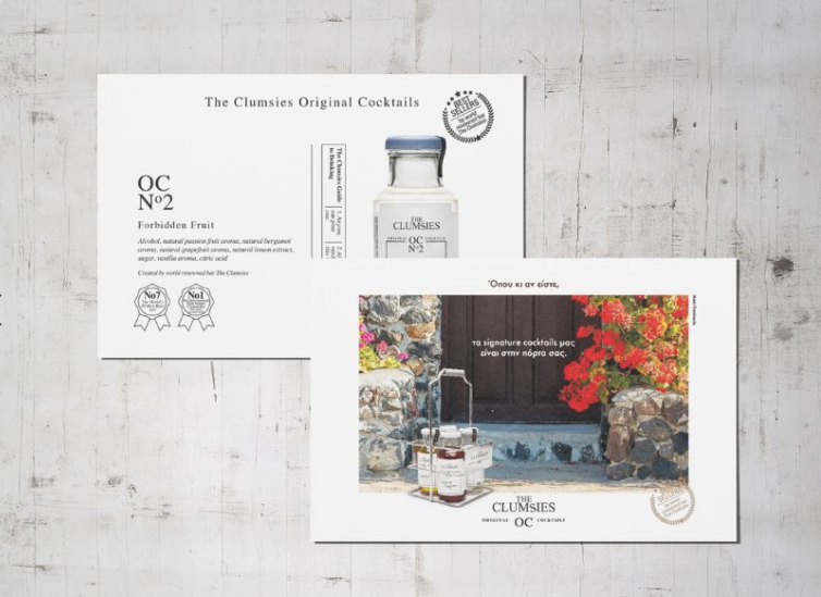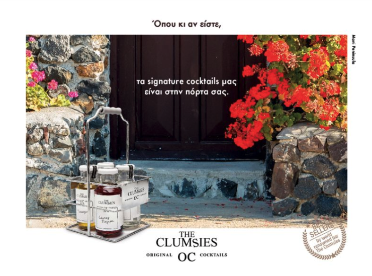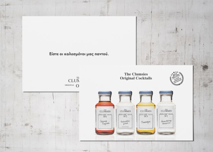 Παράλληλα, η συσκευασία αυτή ενέπνευσε έναν ιδανικό συνοδοιπόρο στη μορφή ενός παραδοσιακού νεαρού γαλατά που διανέμει τα διάσημα signature cocktail σε διαφορετικά σημεία της Ελλάδας με το χαρακτηριστικό ποδήλατο του. Ακόμα και όταν δεν τον βλέπουμε, η παρουσία του υπονοείται από την ειδική θήκη με τα μπουκάλια που αφήνει στις εξώπορτες όλων των καλεσμένων των The Clumsies.
